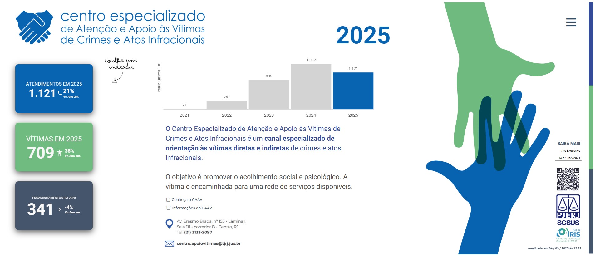 O Tribunal de Justiça do Rio de Janeiro (TJRJ) lançou o Painel do Centro Especializado de Atenção e Apoio às Vítimas de Crimes e Atos Infracionais (CAAV), uma iniciativa que representa um avanço significativo na gestão e no acompanhamento dos atendimentos prestados às vítimas no estado. A ferramenta digital reúne, em um único ambiente, dados atualizados sobre o volume de vítimas, atendimentos por equipes e encaminhamentos, possibilitando uma visão ampla e integrada do fluxo de acolhimento.