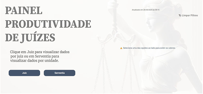 O Painel de Produtividade de Juízes tem a função de trazer a quantidade de atos prolatados por juízes da Primeira Instância desde janeiro de 2005, separado em uma visão específica por magistrado e uma por serventia, à escolha do usuário.