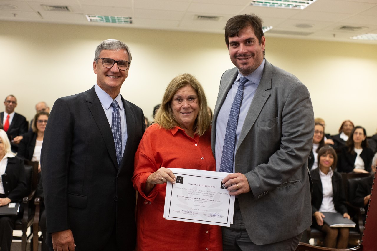 Ao lado da mãe, Maria de Lourdes Goulart Salomão, o filho do desembargador, Paulo César Salomão Filho, agradeceu as homenagens que lembraram o papel do pai na criação do coral, enquanto era presidente da Mútua em 2002.