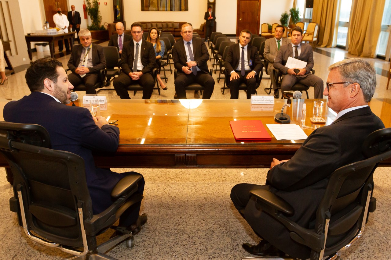 O presidente do TJ, des. Henrique Figueira, e o vice-presidente de Sustentabilidade do BB, Barreto Júnior (à esquerda) durante assinatura do contato