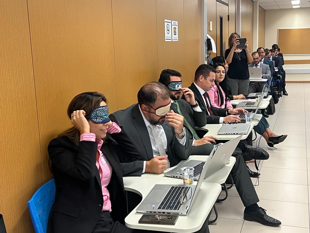 "Ninguém existe em si mesmo. Temos que dar as mãos pela promoção da acessibilidade e da inclusão na prestação dos nossos serviços", diz a condutora da aula sobre 'Direitos da Pessoa com Deficiência', na qual vendou olhos e tapou ouvidos dos novos juízes para que pudessem, assim, ter experiência sensorial e compreender melhor as dificuldades de deficientes visuais e auditivos.