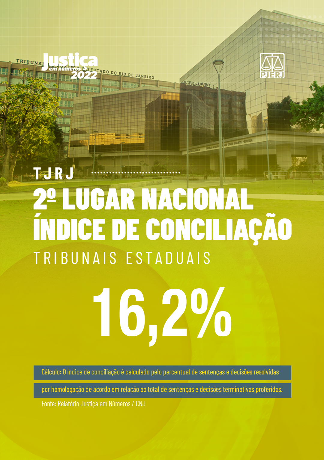 O Justiça em Números 2022 aponta, ainda, que o TJRJ alcançou o percentual de 26,7% no índice de conciliação na fase de conhecimento, no primeiro grau, e de 1,5% na fase de execução, sendo superado pelo TJMS, que atingiu o percentual de 32,2% e 10,6%, respectivamente, nas fases de conhecimento e execução.