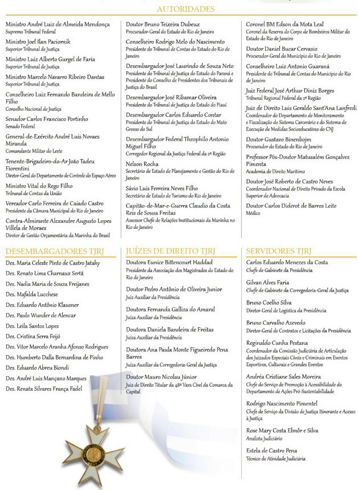 O Tribunal de Justiça do Estado do Rio de Janeiro comemora nesta quinta-feira (8/12) o Dia da Justiça, homenageando personalidades que, direta ou indiretamente, prestaram relevantes serviços à cultura jurídica e ao Judiciário fluminense. A celebração será iniciada às 10h, com a realização de um culto ecumênico. Às 11h, o presidente do TJRJ, desembargador Henrique Carlos de Andrade Figueira, presidirá a cerimônia de entrega do Colar do Mérito Judiciário a 57 personalidades, entre ministros do Supremo Tribunal Federal, do Superior Tribunal de Justiça e do Tribunal de Contas da União, conselheiro do Conselho Nacional de Justiça, presidentes de Tribunais de Justiça estaduais, desembargadores, juízes e servidores do TJRJ, políticos, militares e representantes da sociedade civil, entre outros.