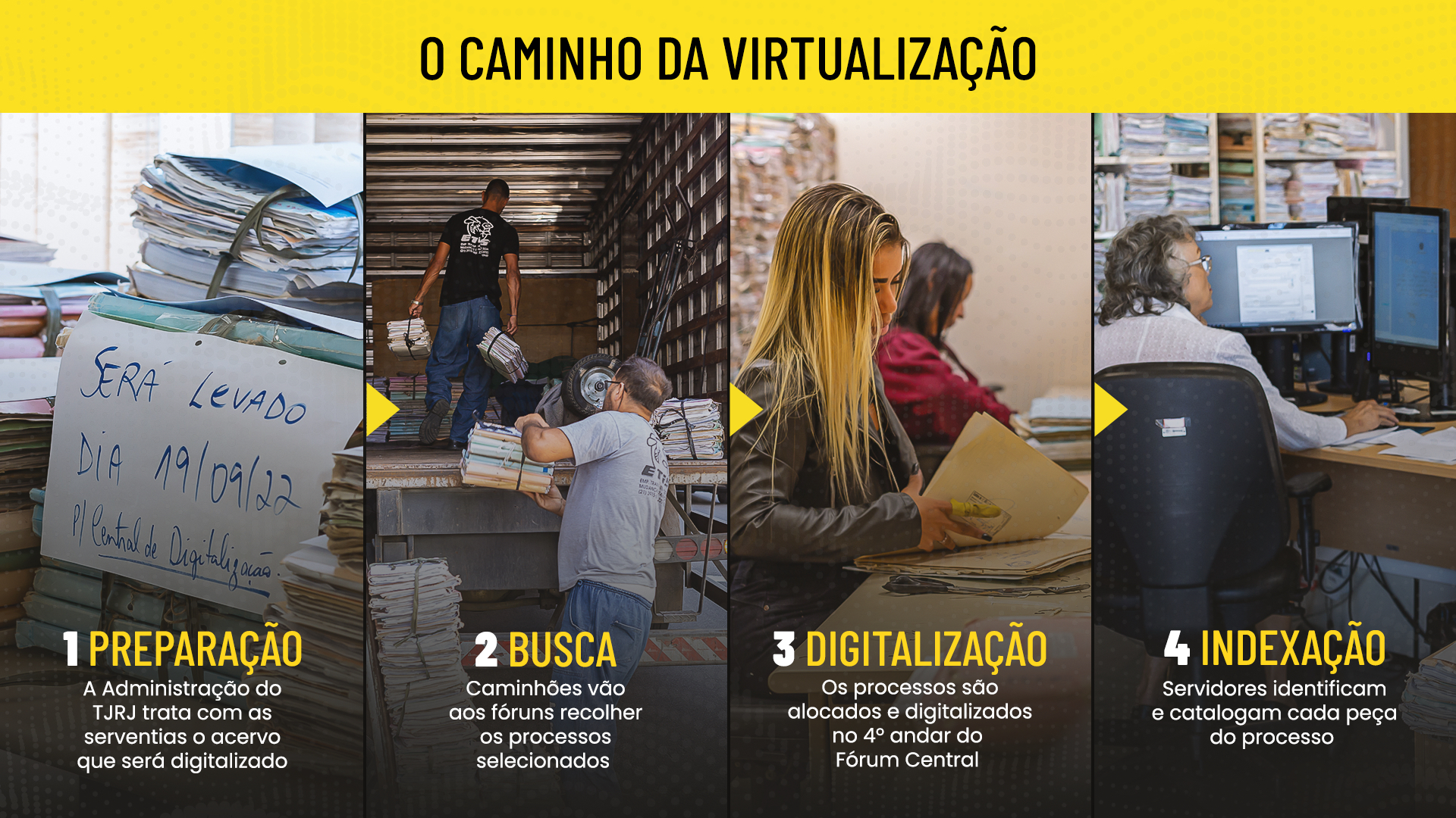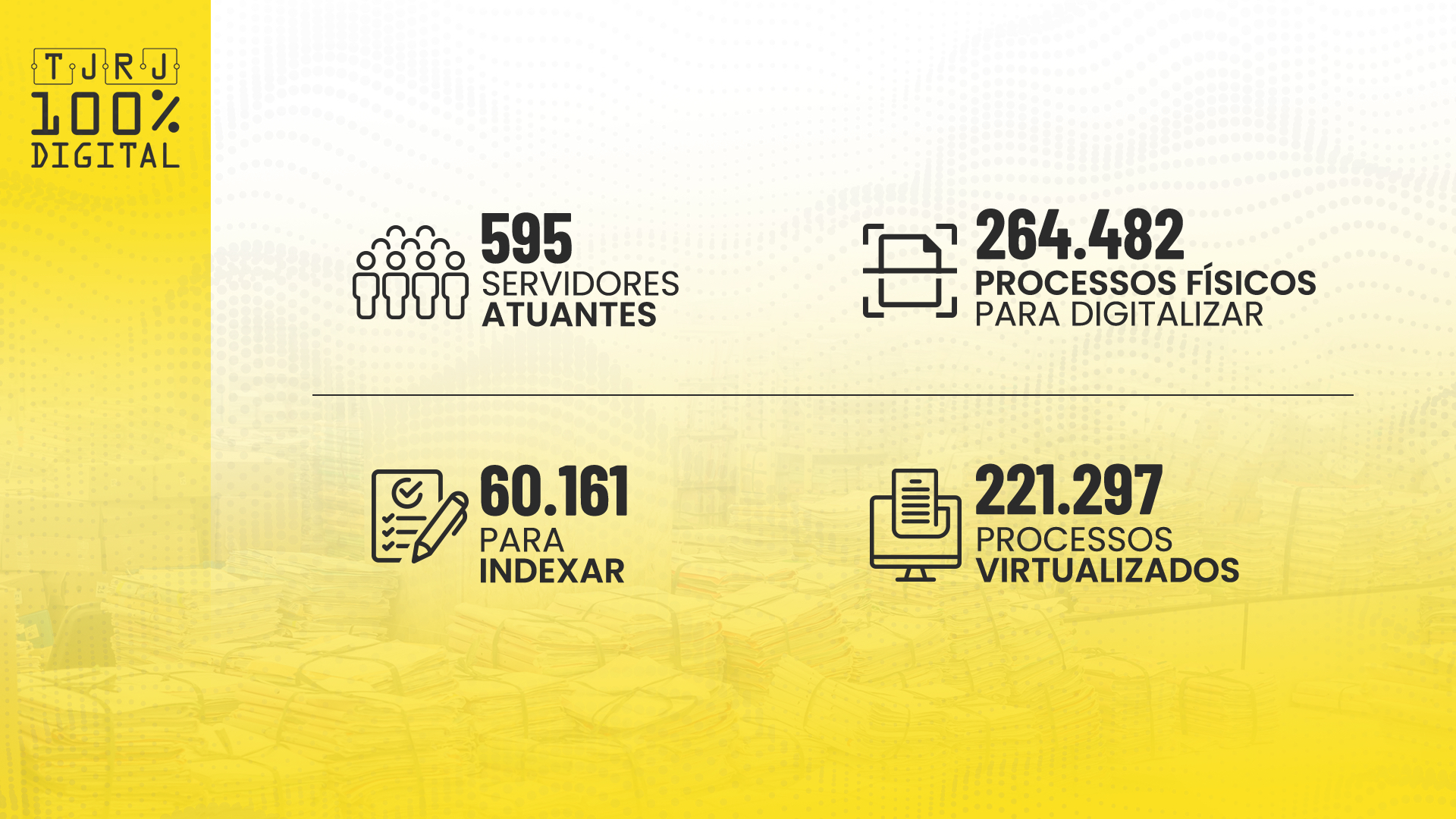 Para cumprir a meta do TJRJ 100% Digital, a Administração do TJRJ traçou uma estratégia que abrange duas frentes de trabalho. A primeira é a preparação dos processos físicos para propiciar a coleta e o transporte feito por caminhões até o Fórum Central, onde se conclui a digitalização. A segunda frente é a indexação dos processos, feita por grupos de servidores que estão trabalhando em regime extraordinário de trabalho.