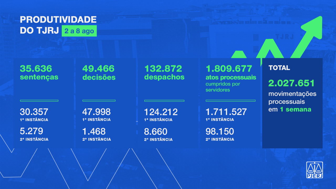 O Tribunal de Justiça do Estado do Rio de Janeiro produziu, na semana de 2 a 8 de agosto, 35.636 sentenças (30.357 na primeira instância e 5.279 na segunda instância), 49.466 decisões (47.998 na primeira instância e 1.468 na segunda instância) e 132.872 despachos (124.212 na primeira instância e 8.660 na segunda instância). No mesmo período, foram cumpridos 1.809.677 atos por servidores (1.711.527 na primeira instância e 98.150 na segunda instância).