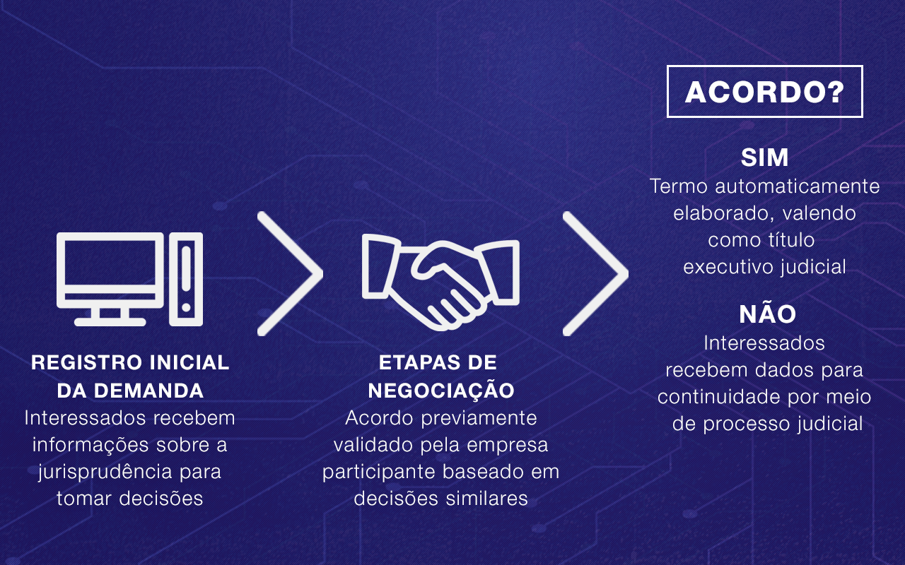 O sistema funcionará da seguinte forma: após o registro inicial da demanda, o interessado recebe informações extraídas do banco de dados da jurisprudência para tomadas de decisão. A cada etapa de negociação, a possibilidade de acordo está previamente validada pela empresa participante, permitindo uma solução antecipada, baseada em decisões anteriores do Judiciário fluminense. Alcançado o acordo, o termo é elaborado automaticamente pelo sistema e homologado, tornando-se válido como título executivo judicial. Caso o acordo não seja obtido, serão informados aos interessados os dados necessários à continuidade do procedimento por via judicial.