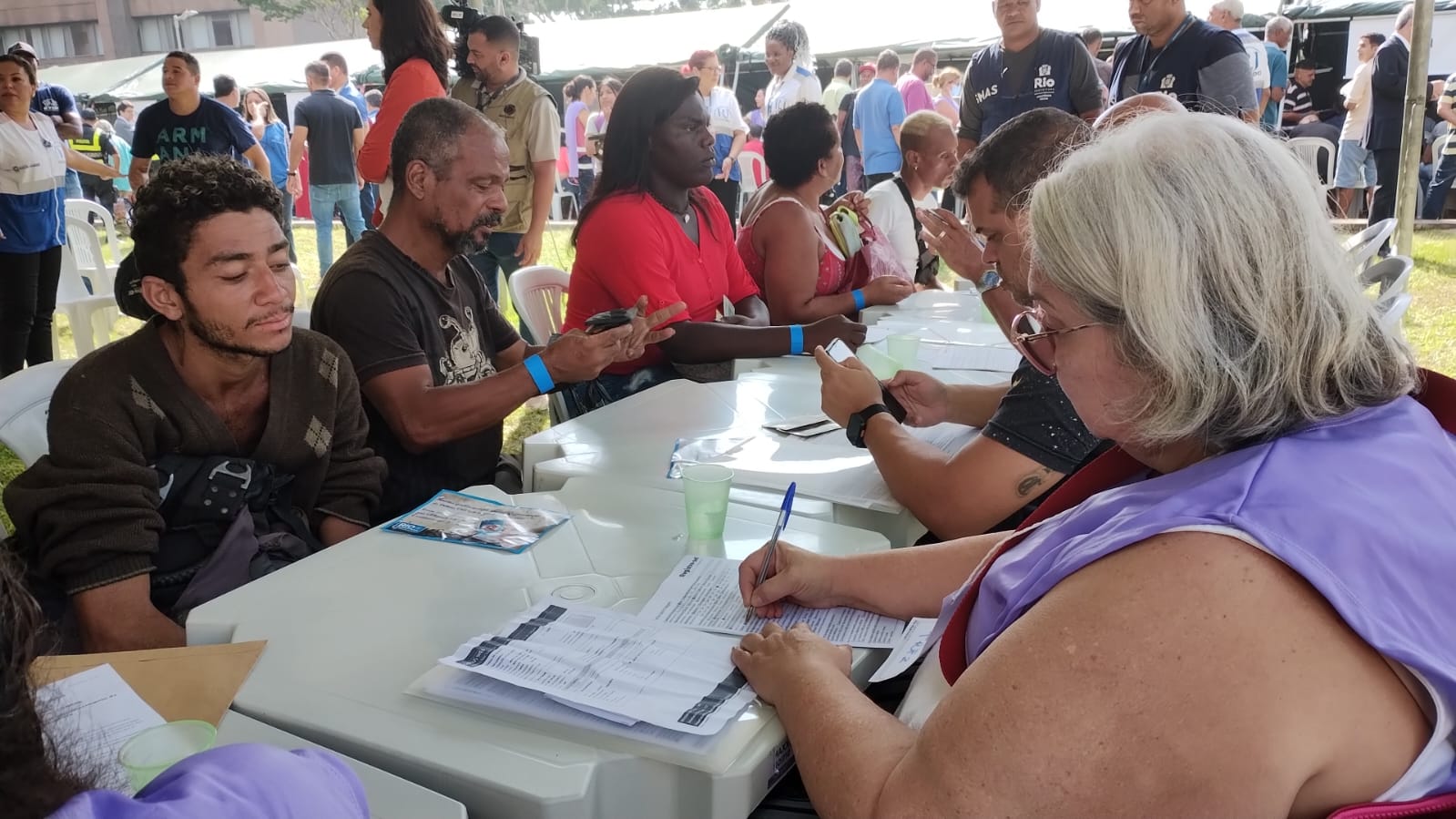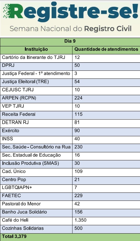 Centenas de pessoas em situação de rua foram beneficiadas por um mutirão de cidadania próximo ao Fórum Central nesta terça-feira (9/5). No segundo dia da Semana Nacional do Registro Civil - Semana Registre-se!, o foco foi a inclusão social por meio da emissão gratuita de documentos. O Tribunal de Justiça do Estado do Rio de Janeiro (TJRJ) e outros órgãos públicos participam do evento, que segue até 11/5 e estima atender mais de 1,5 mil pessoas por dia. Entre os documentos fornecidos estão Certidões de Nascimento, Casamento, Óbito, RG, CPF, Certificado de Reservista, Título de Eleitor, Cadastro Único e CNIS. Foram realizados 3.379 atendimentos no primeiro dia do mutirão.
