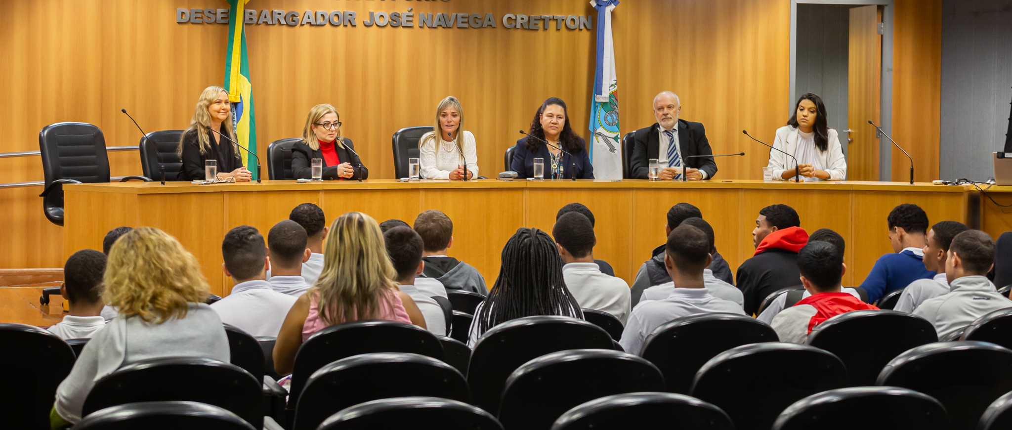 Na mesa da esquerda para direita: Andrea Christina Vaz, diretora do Departamento de Acesso à Justiça, Ação Social e Acessibilidade; Marcia Fayad, diretora da divisão de Ação Social e Acessibilidade; juíza Ana Paula Monte Figueiredo Pena Barros, juíza auxiliar da Presidência; Evangelina Andrade, representante do DEGASE; Antonio Ligiero, secretário-geral de Sustentabilidade e Responsabilidade Social; e Dayane Oliveira Verly, assessora da SGSUS