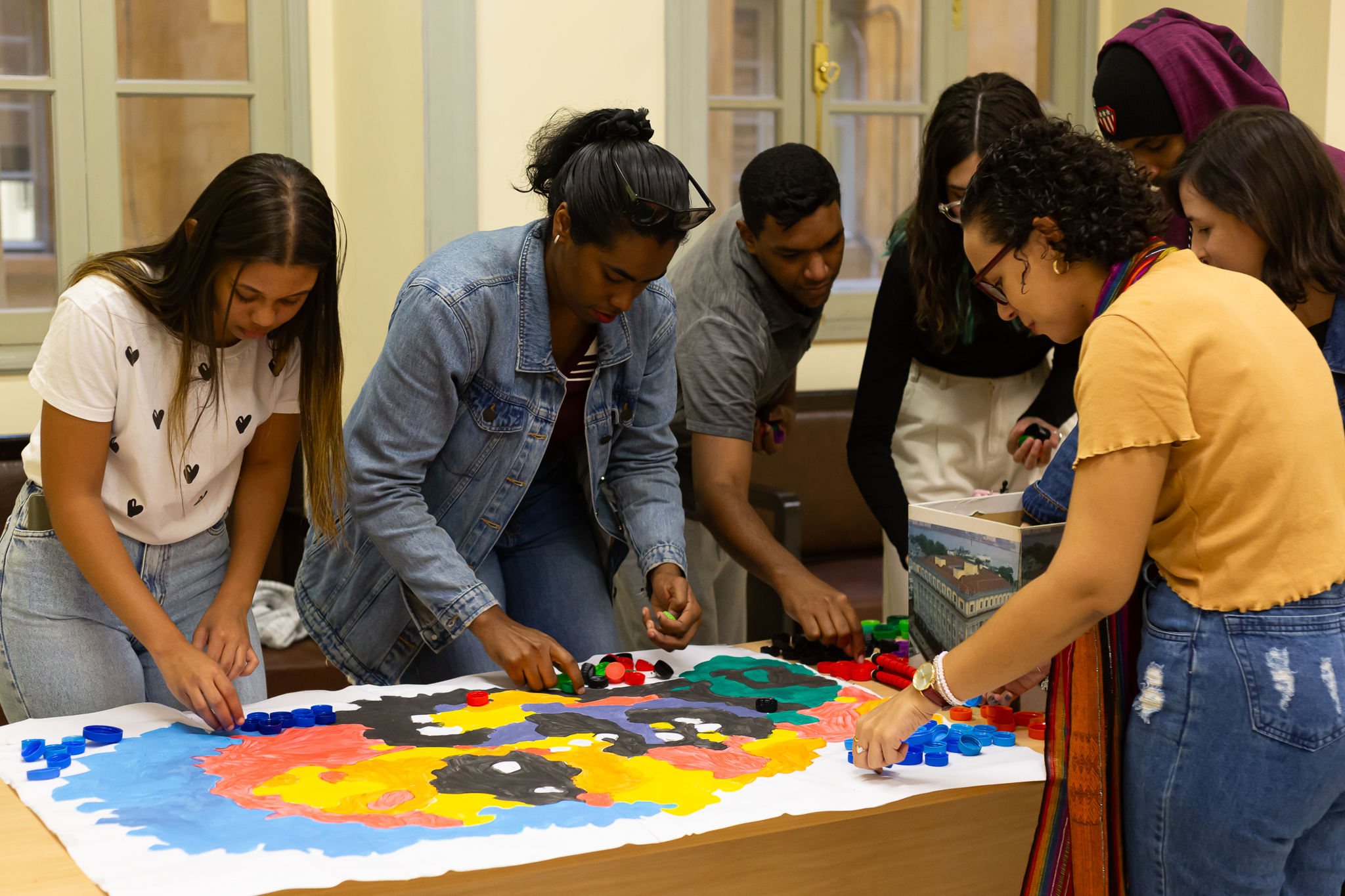 Enquanto os participantes colocavam as tampinhas doadas no desenho para formar o rosto de Tereza de Benguela, a professora Lívia recitou uma poesia de Jarid Arraes, em que narrava a vida e a morte da líder quilombola do século XVIII. O novo retrato de Tereza de Benguela estará exposto no espaço educativo do Museu da Justiça.