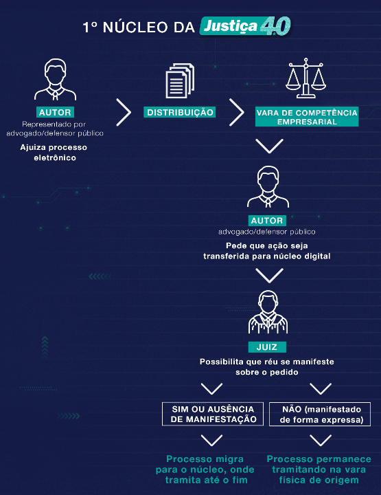 O autor da ação da matéria de competência do núcleo, representado por um advogado ou pela Defensoria Pública, ao ajuizar o processo eletrônico, faz um requerimento ao juiz da vara empresarial à qual foi distribuído solicitando que o processo seja transferido ao núcleo digital. Em seguida, o magistrado solicita a manifestação do réu. Caso ele concorde ou não se manifeste, o processo é remetido ao núcleo, composto por três juízes. Desta forma, a ação sairá da vara física de origem e será processada e julgada pelo 1º Núcleo. Apenas se o réu se opuser expressamente o processo permanecerá na vara física inicial.