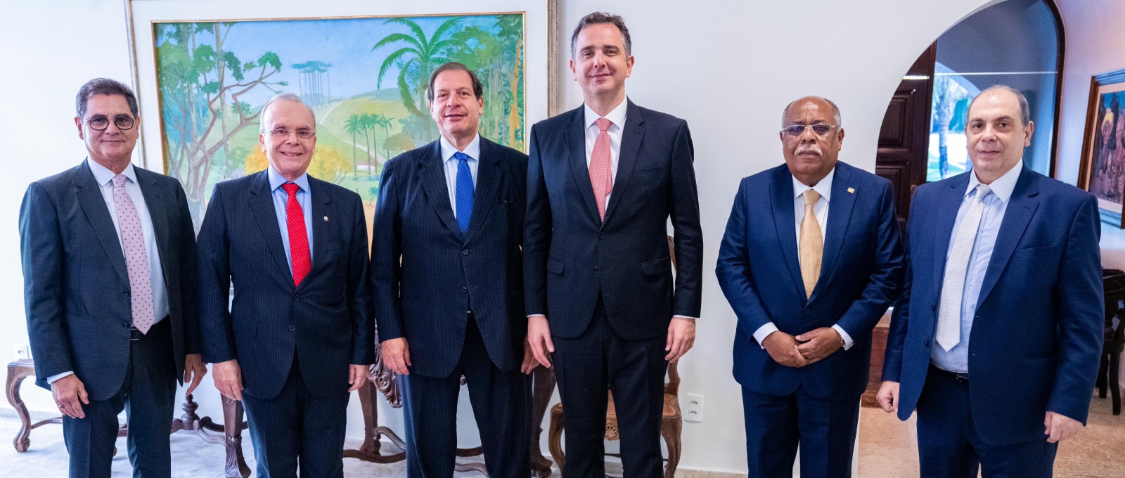 Da esquerda para a direita: os desembargadores Agostinho Teixeira de Almeida Filho e Ricardo Rodrigues Cardozo (presidente do TJRJ); o ministro do STJ Luís Felipe Salomão (corregedor nacional da Justiça); o presidente do Senado Federal Rodrigo Pacheco; e os ministros do STJ Benedito Gonçalves e Messod Azulay Neto