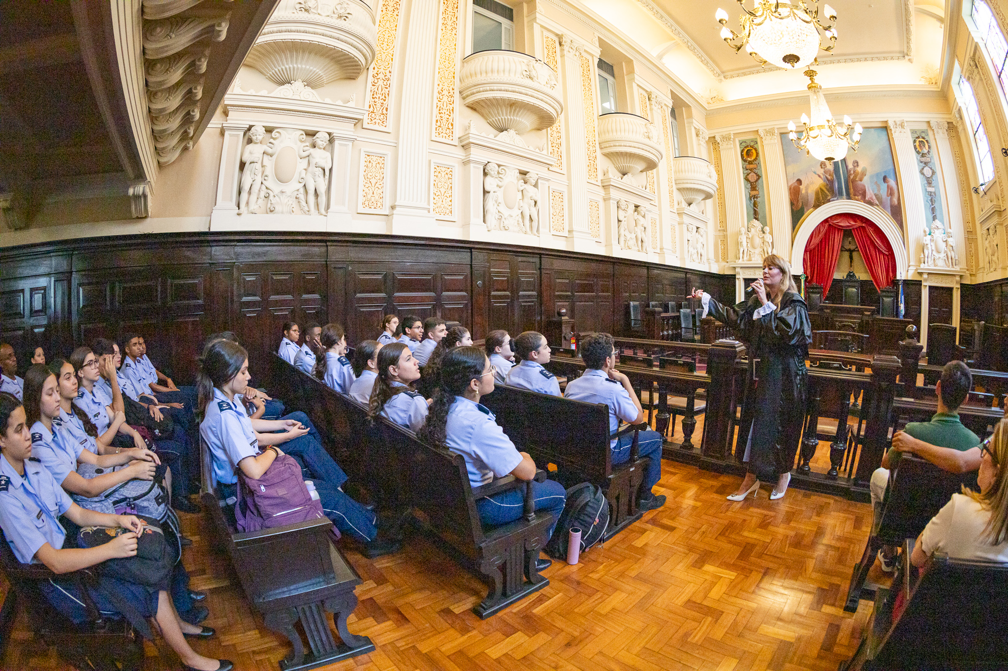 Na encenação de um julgamento realizado no primeiro Tribunal do Júri do Rio, que foi um júri federal até a década de 1960, a jovem Aline Barros da Silva, de 15 anos, pode vivenciar por alguns instantes seu sonho de ser juíza. “Eu já tinha planos de visitar esse museu. É a minha primeira vez aqui dentro. Tenho muito interesse na área judicial. Minha mãe e minha tia fizeram Direito. Então, eu também quero fazer porque é um legado na família. Eu quero ser juíza, mas também penso em ser delegada. Quando me sentei na poltrona do juiz no Tribunal do Júri senti uma imponência e pensei ‘um dia eu vou chegar lá’”, concluiu.
