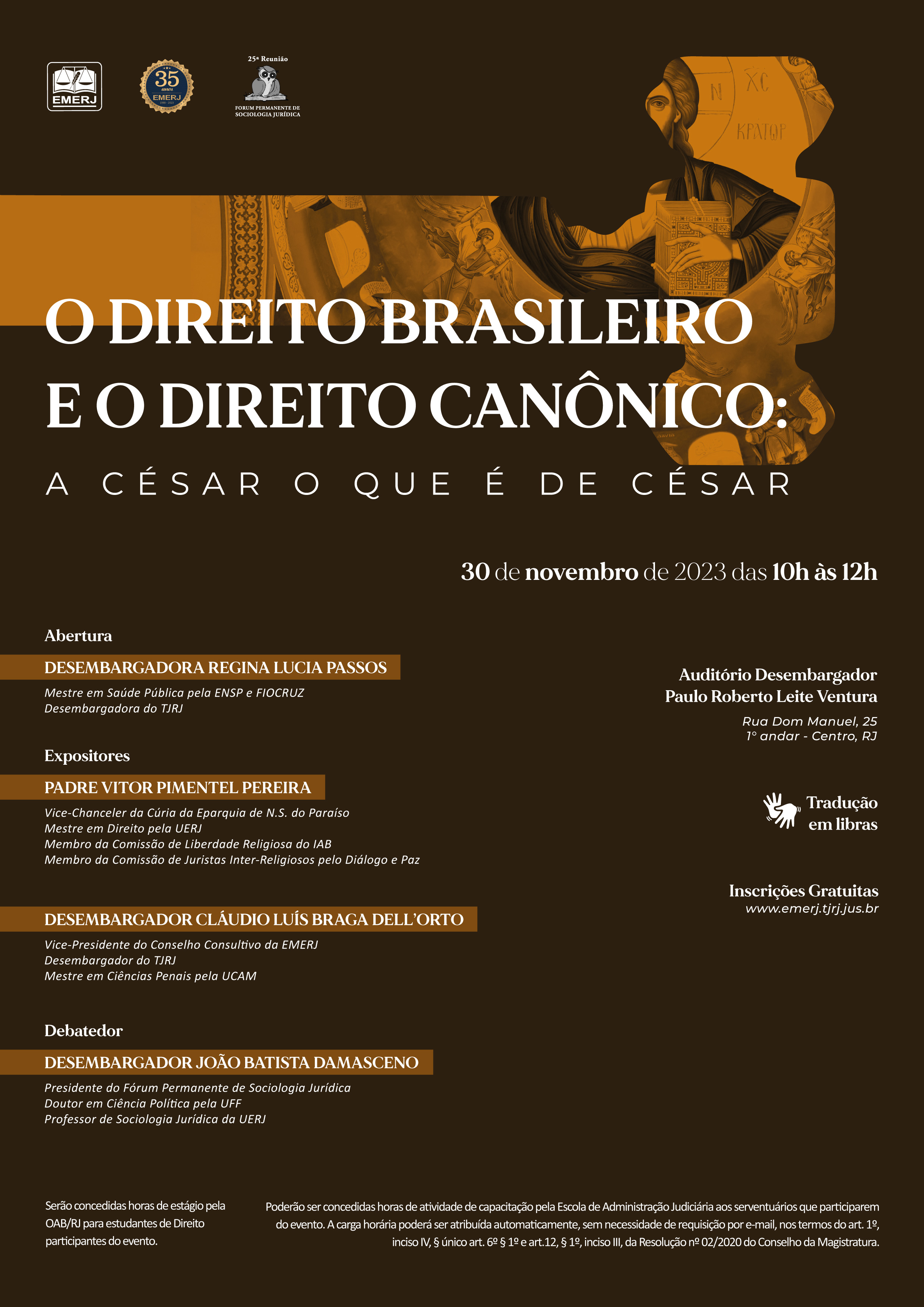 A abertura do evento será feita pela Desembargadora Regina Lúcia Passos e os expositores serão o Padre Vitor Pimentel Pereira e o Desembargador Cláudio Luis Braga Dell´Orto.