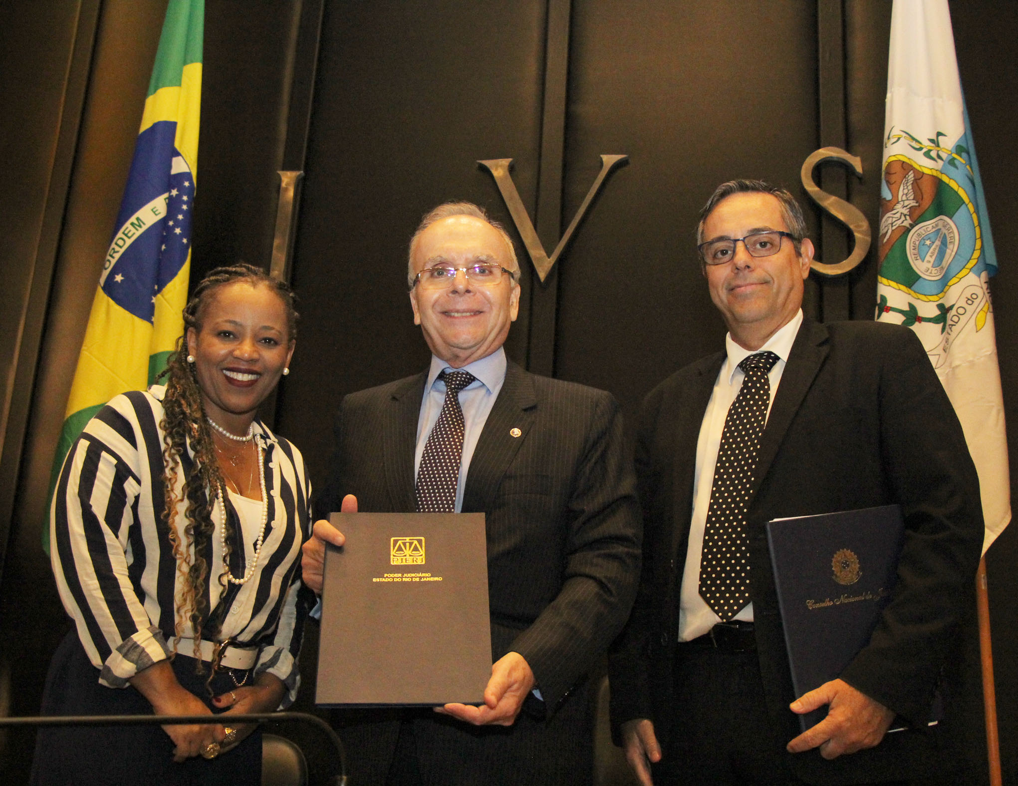 A secretária-geral do CNJ Adriana Cruz, o presidente do TJRJ Ricardo Cardozo e o secretário de Estratégia e Projetos do CNJ Gabriel Matos