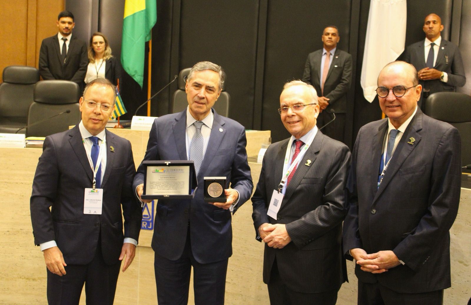 Ministro Luís Roberto Barroso exibe a placa e medalha recebidas em homenagem prestada pelo Consepre, ao lado dos presidentes Carlos Alberto França (TJGO), Ricardo Rodrigues Cardozo (TJRJ) e José Arthur Filho (TJMG)
