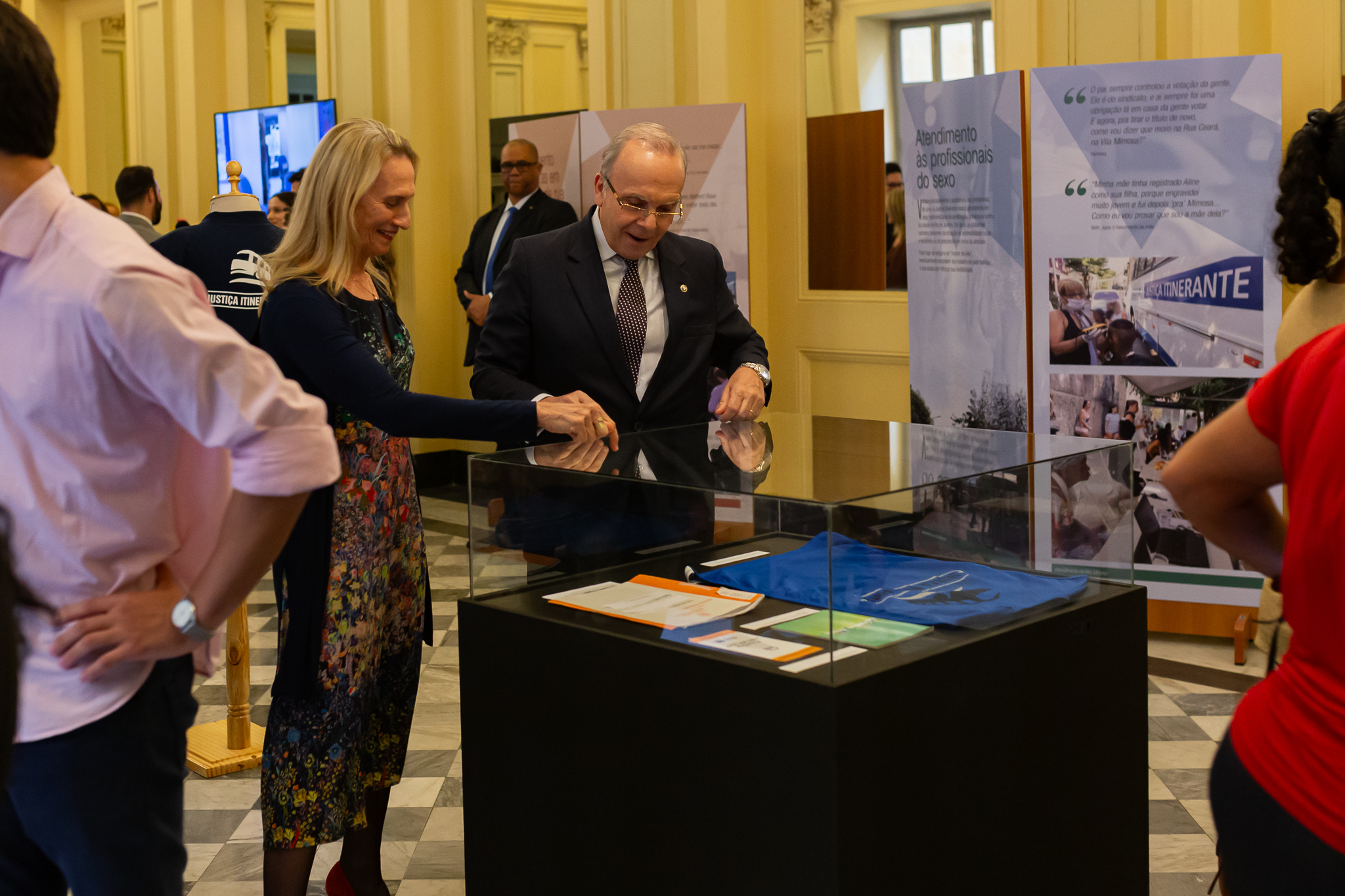 Desembargadora Cristina Tereza Gaulia e presidente do TJRJ, desembargador Ricardo Rodrigues Cardozo, visitam exposição "Justiça Itinerante: 20 anos"