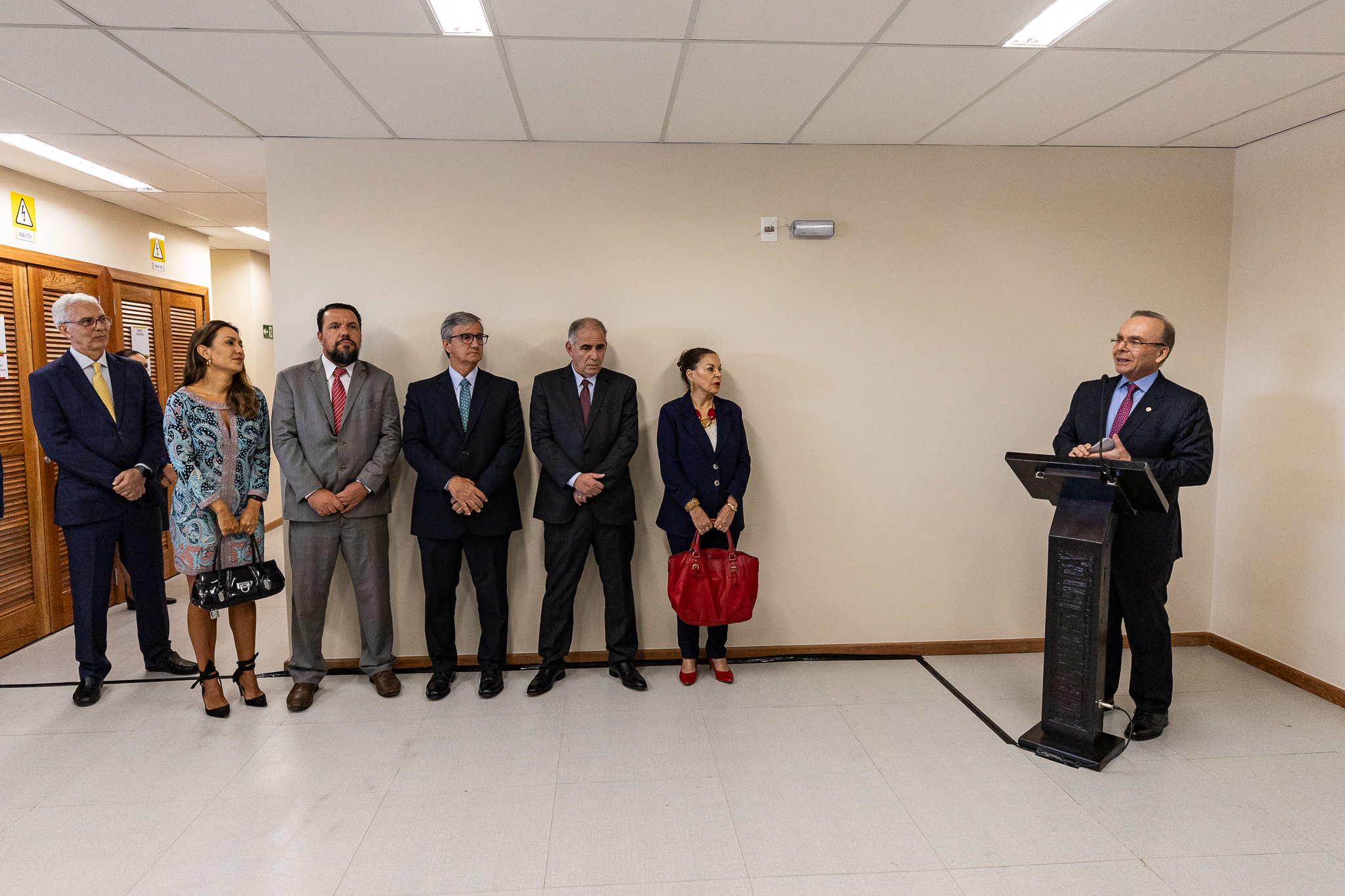 O presidente do TJRJ, desembargador Ricardo Cardozo, discursa durante a inauguração do NAI, ao lado dos desembargadores Wagner Cinelli, Henrique Figueira, Marcus Basílio e Suely Magalhães, e dos juízes Vanessa Cavalieri e Glauber Bitencourt