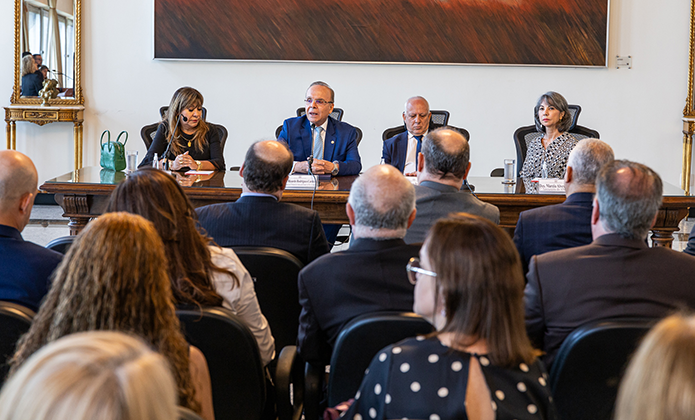 Compuseram a mesa durante a cerimônia a desembargadora Isabella Pessanha Chagas, da 10ª Câmara de Direito Público; o presidente do TJRJ, desembargador Ricardo Rodrigues Cardozo; o desembargador Cláudio Dell’Orto, presidente da 9ª Câmara de Direito Público; e a desembargadora Marcia Alves Succi, 1ª Tesoureira da Amaerj