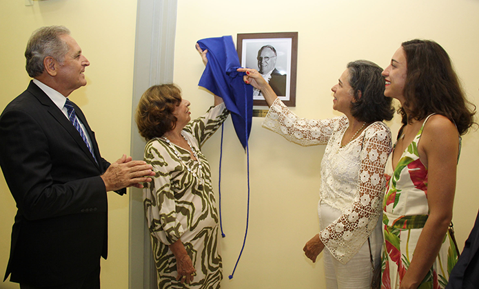 O desembargador Fabio Dutra, presidente da Andes, aplaude o descerramento do retrato do desembargador Manoel Carpena Amorim pela viúva, Marlene, e a filha, Heloisa, do magistrado, ao lado na neta Isabella
