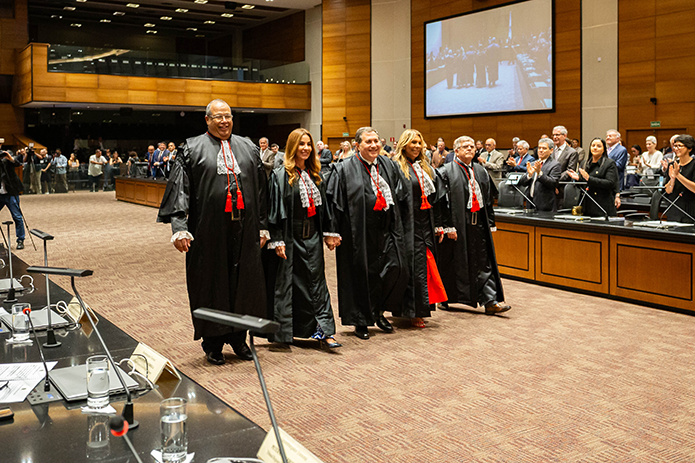 O desembargador Peterson Simão foi conduzido ao plenário pelas desembargadoras Helda Lima Meirelles e Renata Machado Cotta e pelos desembargadores Guaraci Campos Vianna e Luiz Henrique de Oliveira Marques