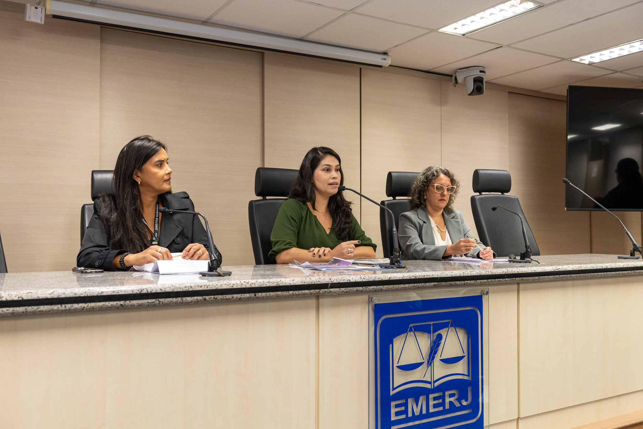 Da esquerda para a direita: Érica Paes, Superintendente de Empoderamento e Equidade de Gênero da Secretaria de Desenvolvimento Social e Direitos Humanos do Estado; a moderadora Flávia Azevedo, assistente social do TJRJ; Daniela Valle, juíza do Trabalho no TRT-1, Presidente da AMATRA1