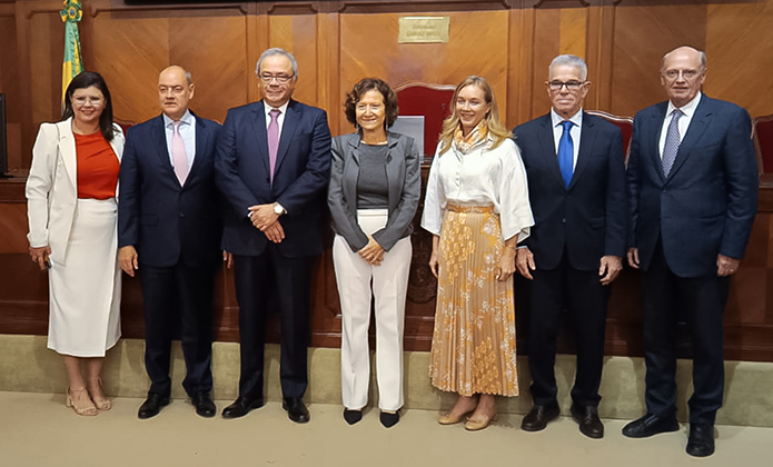 Da esquerda para a direita: a conselheira do CNJ, Daiane Lira; o presidente do TJRJ, desembargador Ricardo Couto; o presidente do TRF-2, desembargador Luiz Paulo da Silva Araújo Filho; a presidente da Academia Nacional de Medicina, Eliete Bouskela; a desembargadora federal do TRF-2, Carmem Silva; o ministro Antonio Saldanha Palheiro, do STJ; e o acadêmico Giovanni Guido Cerri