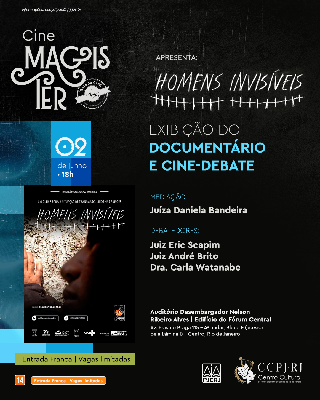 Inaugurando a programação do mês, o Auditório Desembargador Nelson Ribeiro Alves recebe na segunda-feira (2 de junho), às 18h, o Cine Magister. Em sua segunda edição, o programa apresenta o documentário “Homens Invisíveis”, um média-metragem que retrata as condições de pessoas transmasculinas em presídios a partir da análise de pesquisadores e relatos dos internos. Após a exibição do filme, o CCPJ-RJ convida a advogada e titular do 28° Tabelião de Notas de São Paulo, Carla Watanabe, para um cine-debate mediado pela juíza Daniela Bandeira e com a participação dos juízes Eric Scapim e André Brito.