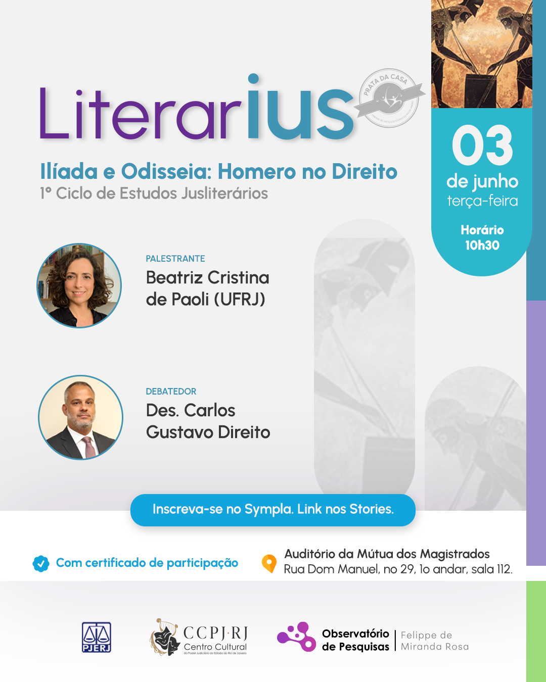 Na terça-feira (3 de junho), às 10h30, o Observatório de Pesquisas Desembargador Felippe de Miranda da Rosa, uma divisão do CCPJ-RJ, inaugura o programa LiterarIus, que receberá especialistas para debater textos relevantes e promover reflexões sobre a importância deles na formação do imaginário humano, suas instituições e símbolos. O encontro inaugural do 1° Ciclo de Estudos Jusliterários: A Grécia e a formação do Humano tem o tema “Da Ilíada à Odisseia: uma introdução ao mundo de Homero” como base para o debate, que contará com a participação do desembargador Carlos Gustavo Direito e da professora doutora Beatriz de Paoli, que ensina Língua e Literatura Grega na UFRJ. O evento será realizado no Auditório da Mútua dos Magistrados e terá transmissão online através da plataforma Teams.