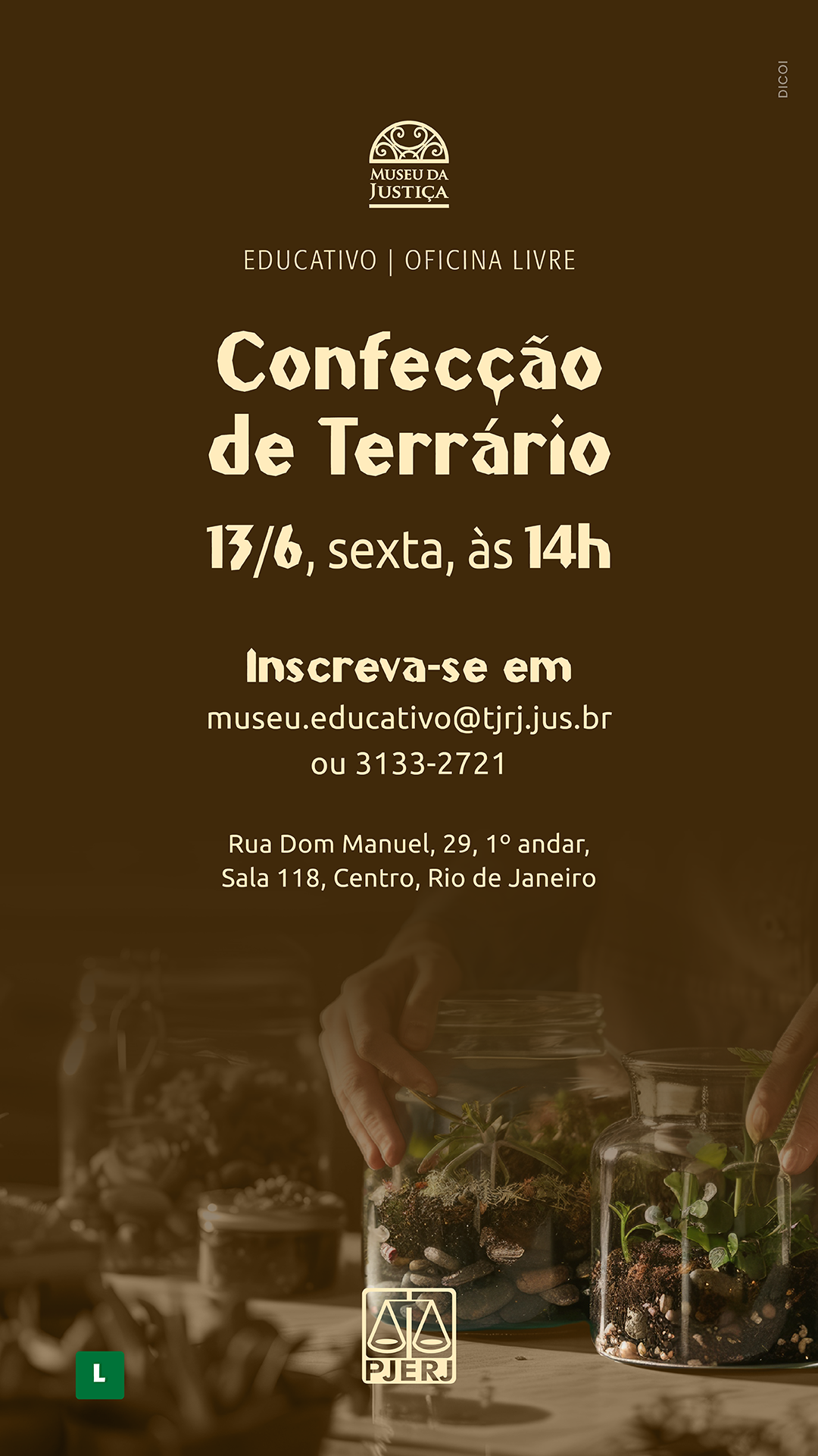 O Museu da Justiça do Rio de Janeiro promove, no dia 13/06, às 14h, a oficina livre “Confecção de Terrário”. A atividade convida o público a montar mini-jardins em recipientes de vidro, unindo criatividade, sustentabilidade e bem-estar. A proposta é estimular o contato com a natureza em ambientes urbanos, com orientação passo a passo.