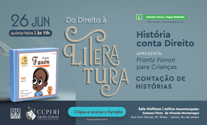 No dia 26/06, às 11h, o programa História conta Direito, do Centro Cultural do Poder Judiciário, receberá alunos da rede pública para uma sessão especial de contação de histórias sobre o filósofo Frantz Fanon. O encontro terá participação do juiz André Nicolitt, autor do livro infantil sobre Fanon, da contadora Talita Leoneli e do músico Marcelo Sant’Anna, que explorarão, com histórias e música, as ideias do filósofo desde sua infância.
