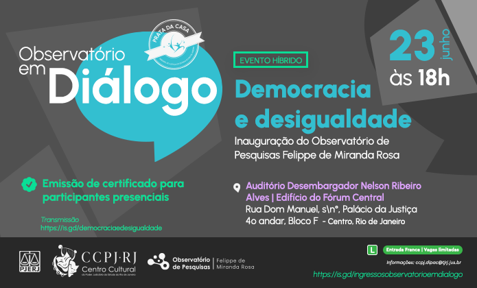 O Observatório de Pesquisas Felippe de Miranda Rosa, ligado ao Centro Cultural do Poder Judiciário, realiza no dia 23/06, às 18h, sua inauguração oficial com palestra do sociólogo Jessé Souza. O encontro será mediado pelo magistrado André Nicolitt e abordará as relações entre democracia e desigualdade no Brasil. O evento ocorre presencialmente no Auditório Nelson Ribeiro Alves e terá transmissão ao vivo pela plataforma Teams.