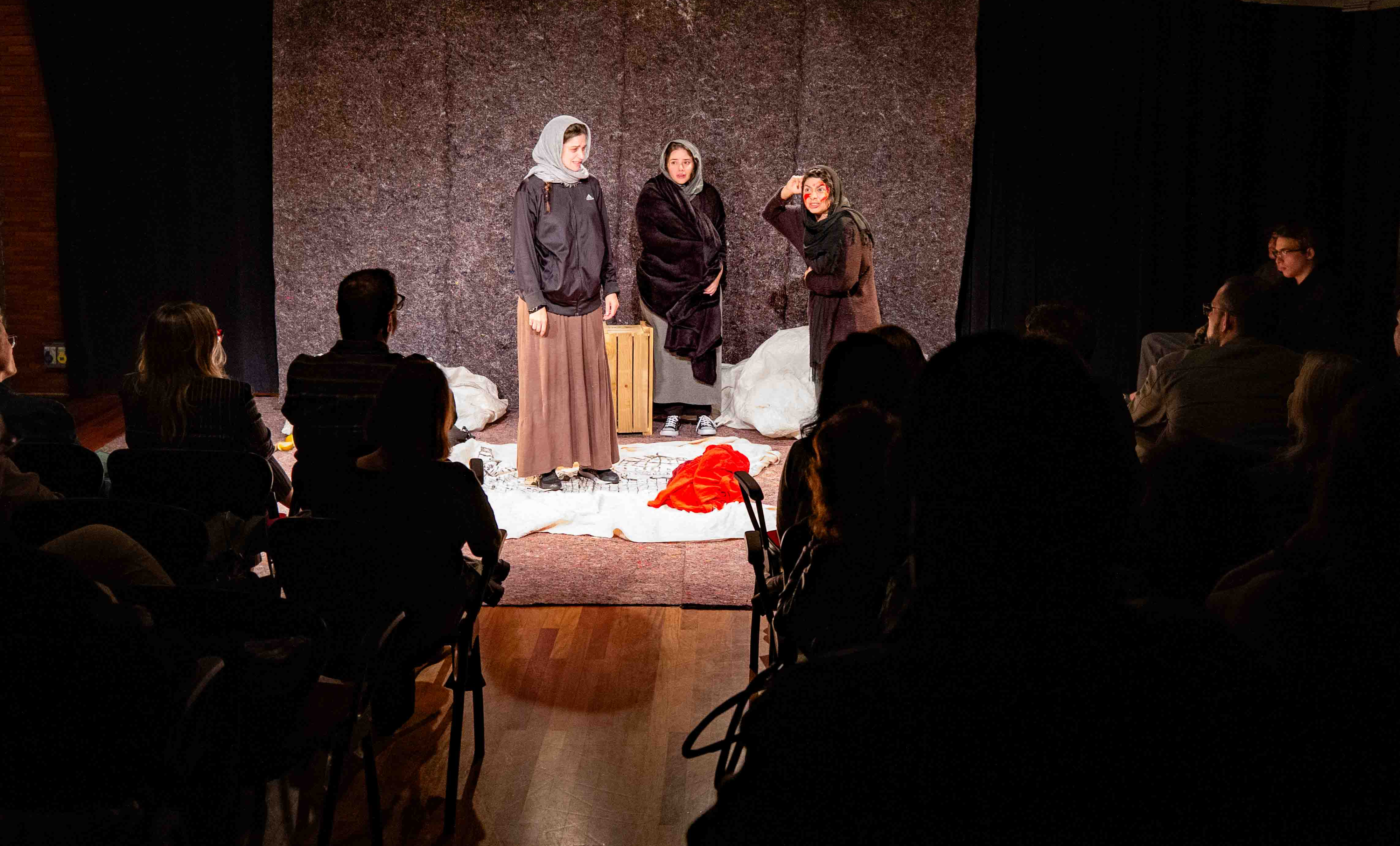 “A história que vamos contar aconteceu no outono de 2019. O frio se aproximava. É madrugada no campo de refugiados de Moria, na Ilha de Lesbos, na Grécia. Um desterro. Mais de 15 mil pessoas se amontoam em um lugar planejado para duas mil, cercado por telas de arame e encimados por rolos de arames farpados”, contextualizou a atriz Deborah Sargentelli, interpretando Shadi, na abertura da peça.