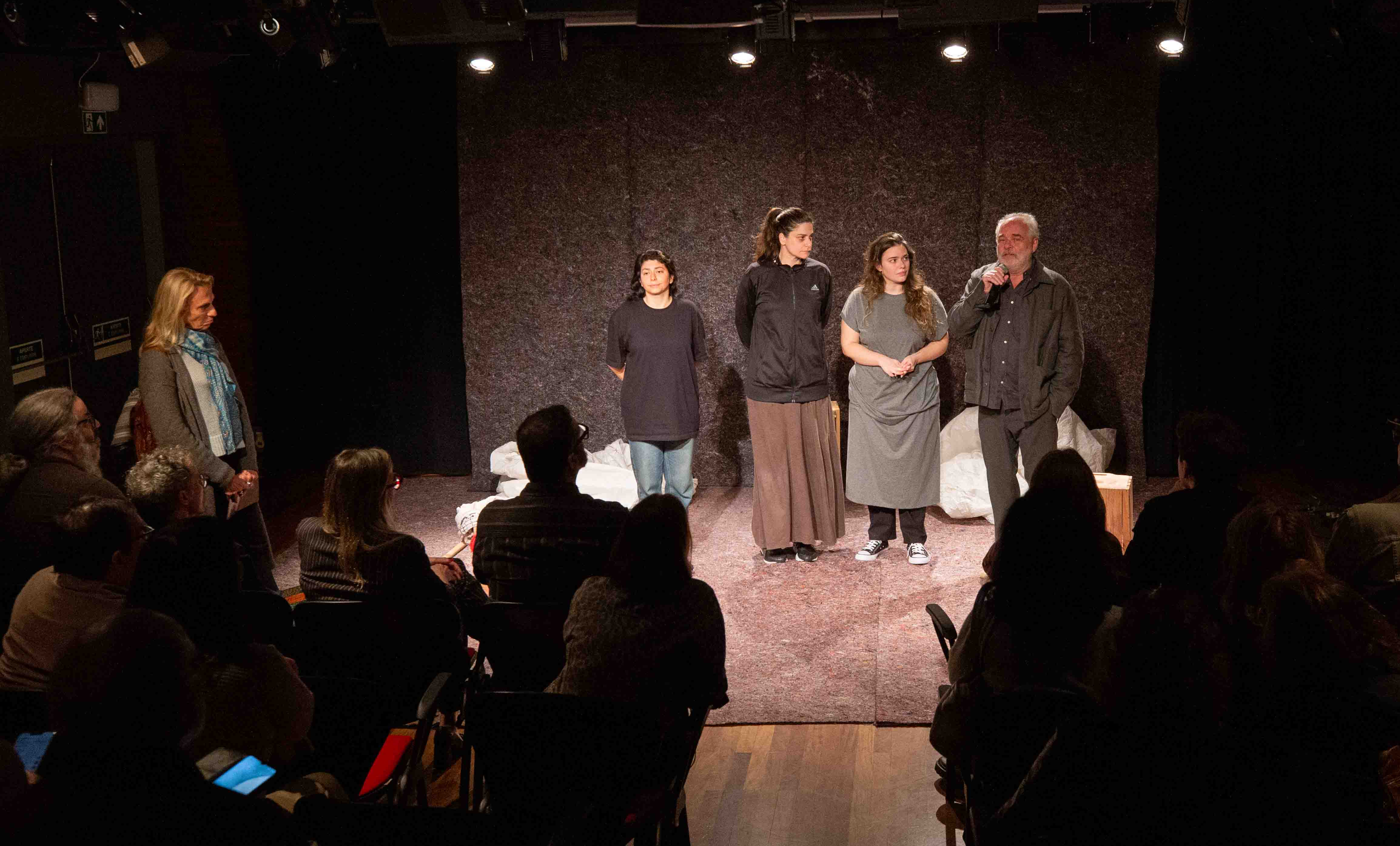 Entusiasta das artes, especialmente do teatro, a desembargadora Cristina Tereza Gaulia, de pé, à esquerda, ouve as considerações do diretor Moacyr Góes sobre a peça, feitas ainda no palco ao lado das atrizes Luiza Vianna, Tarciana Giesen e Deborah Sargentelli