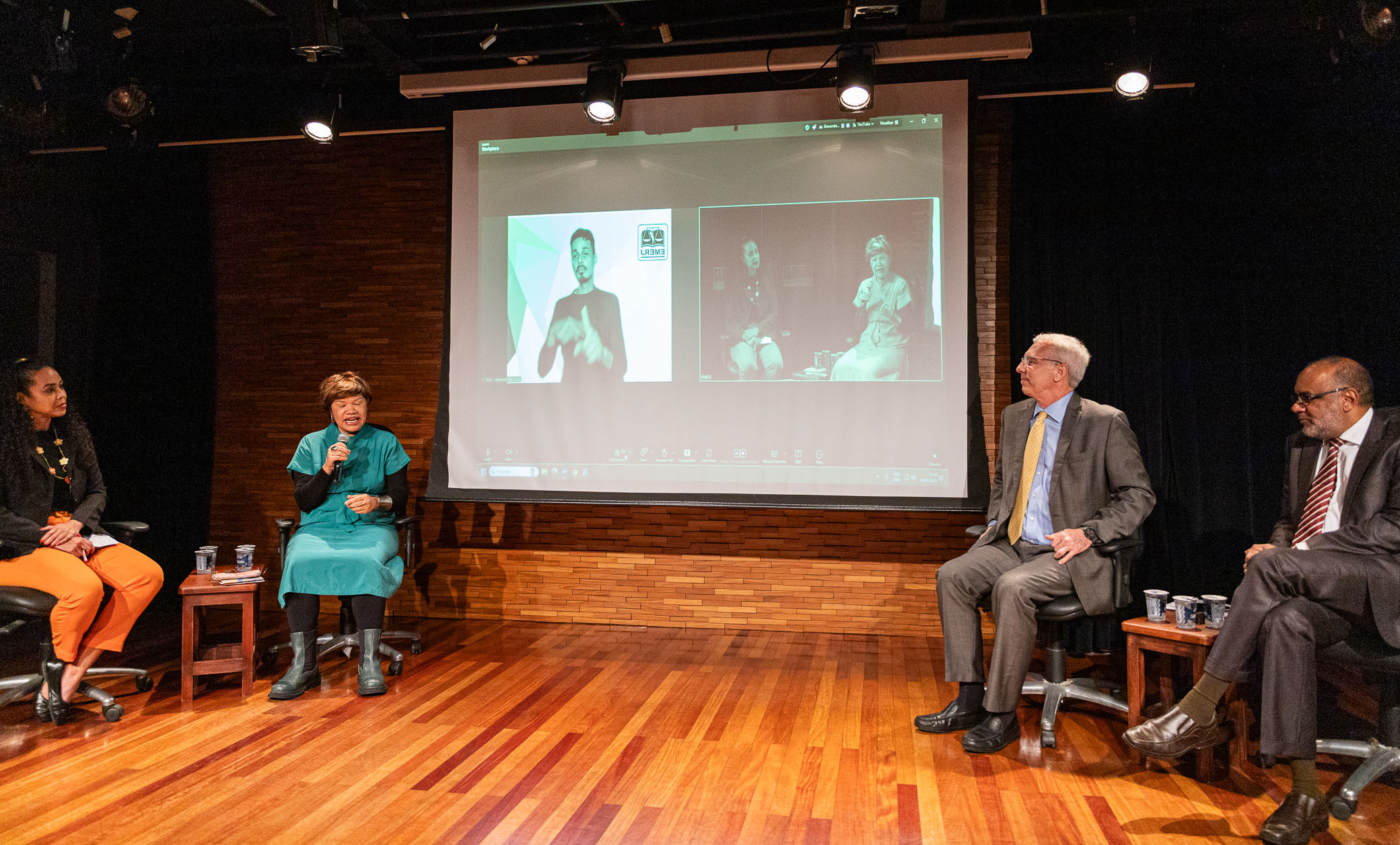 Da esquerda para a direita: a historiadora Tatiana Lima Brandão, a diretora Val Gomes, o desembargador Wagner Cinelli e o juiz André Nicolitt participaram do debate junto às exibições