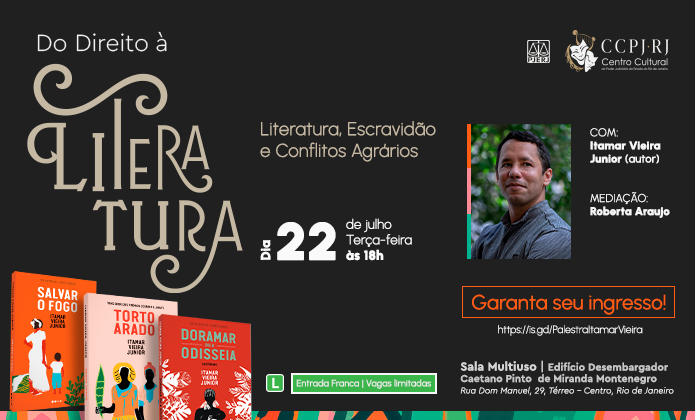 No dia 22/07 (terça-feira), às 18h, o escritor Itamar Vieira Junior participa do programa “Do Direito à Literatura”, com palestra sobre as relações entre “Literatura, escravidão e conflitos agrários”. Após a fala, será entrevistado pela pesquisadora Roberta Araujo, com interação do público.