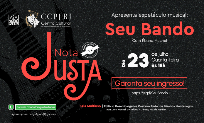O projeto Nota Justa recebe, em 23/07 (quarta-feira), às 18h, a banda Seu Bando, com repertório de clássicos da música brasileira, do samba ao pop rock. O grupo integra o selo Prata da Casa e é formado por servidores do TJRJ. A apresentação é gratuita e com vagas limitadas.