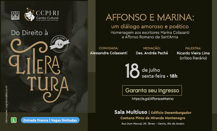 O programa “Do Direito à Literatura” homenageia os escritores Affonso Romano de Sant’Anna e Marina Colasanti no dia 18/07 (sexta-feira), às 18h. O evento inclui a exibição do minidocumentário Marina Colasanti: entre a sístole e a diástole, seguido de bate-papo com a diretora Alessandra Colassanti, mediado pela desembargadora Andréa Pachá. O crítico Ricardo Vieira Lima comentará as poéticas dos autores.