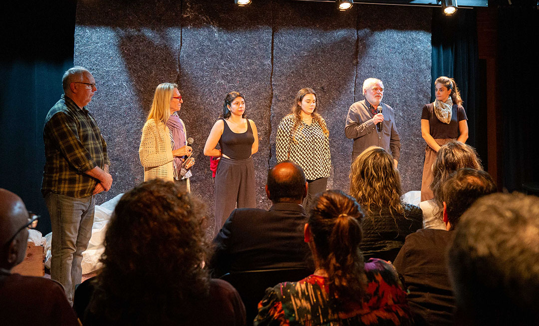 A desembargadora Cristina Gaulia (segunda, da esquerda para direita), com integrantes do elenco e da produção conversam com o público após a apresentação da peça, na Sala Multiuso