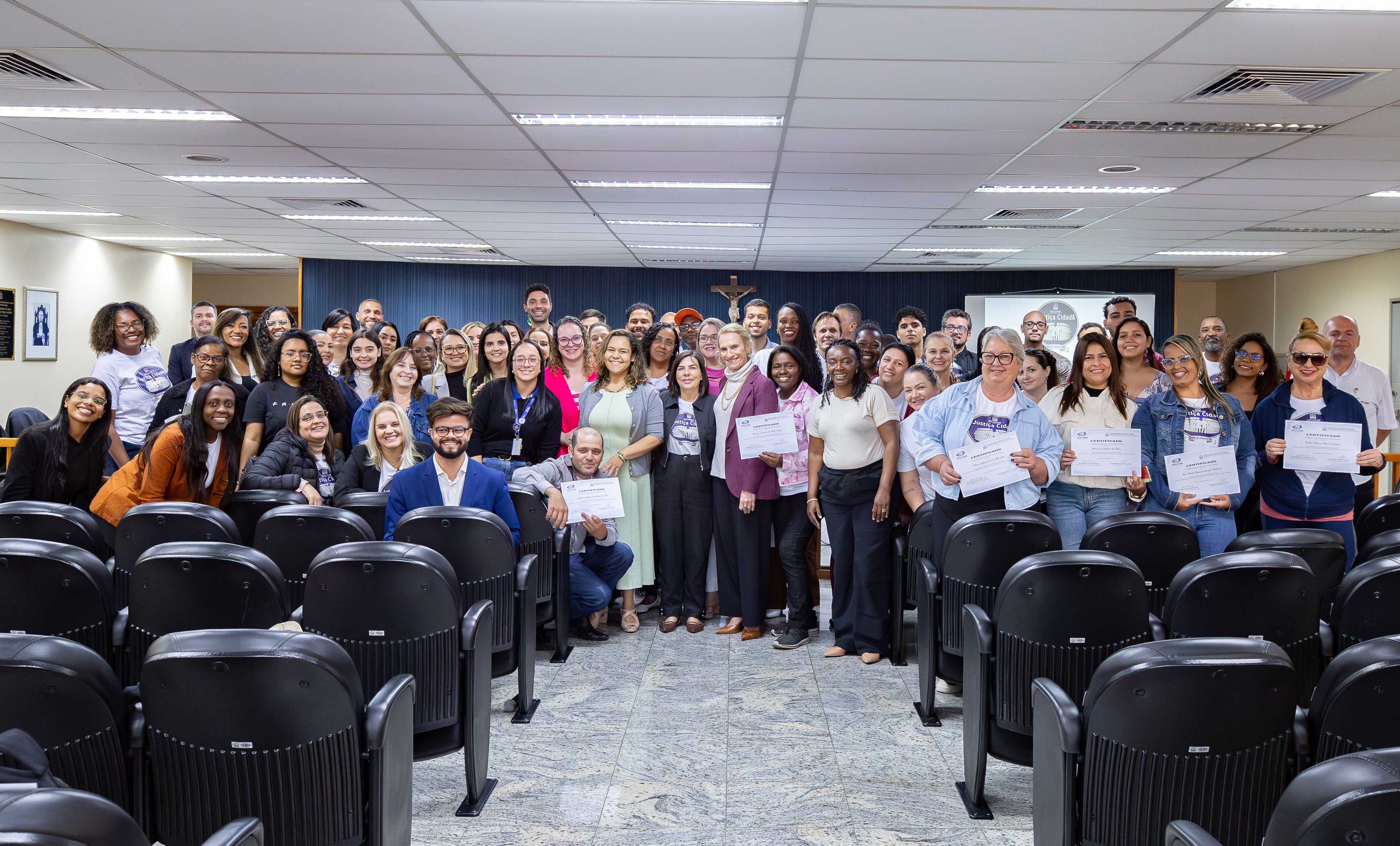 Alunos do programa Justiça Cidadã, no Fórum de Barra Mansa, com a coordenadora do projeto, desembargadora Cristina Gaulia