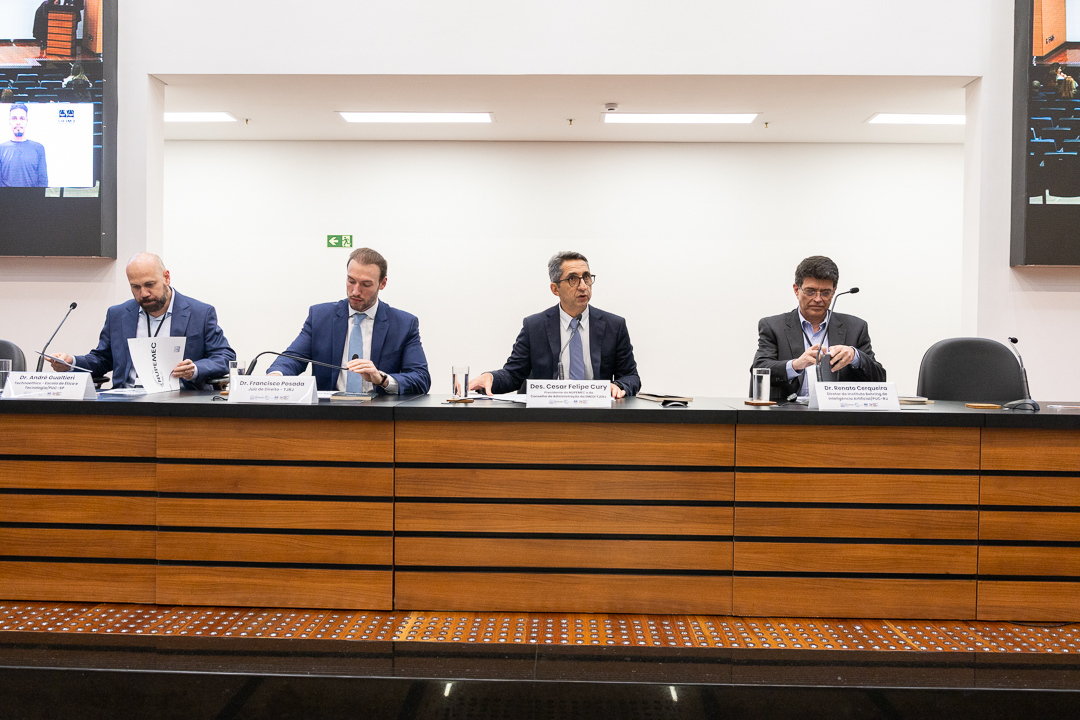 O desembargador Cesar Felipe Cury presidiu a quarta mesa ao lado do diretor-geral da Emedi, juiz Francisco Emílio de Carvalho Posada; do fundador da plataforma de estudos de ética aplicada à tecnologia Technoethics, André Gualtieri de Oliveira; e do diretor do Instituto PUC–Behring de Inteligência Artificial, professor Renato Fontoura de Gusmão Cerqueira. No painel, eles abordaram o tema da tecnologia à serviço da consensualidade e eficiência na resolução de conflitos.
