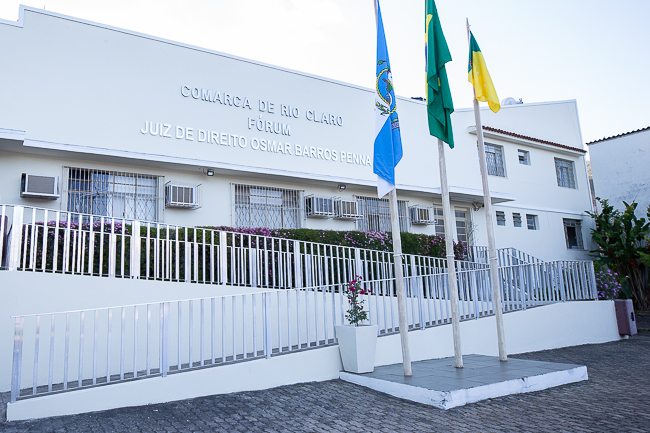 Nova fachada do Fórum da Comarca de Rio Claro com a nomeação em homenagem ao juiz