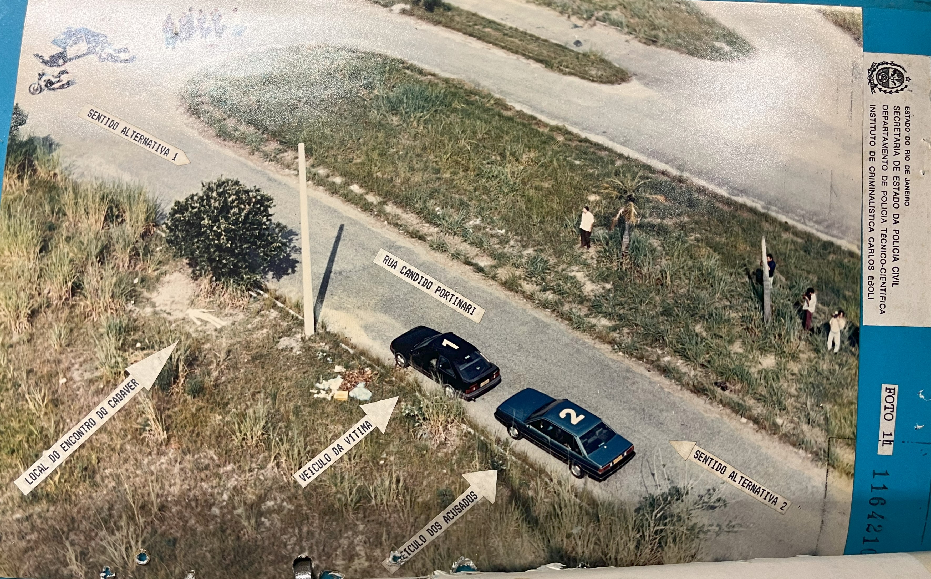 Evidência fotográfica demonstrando uma descrição detalhada da cena do crime, incluindo os carros de Daniella e Guilherme