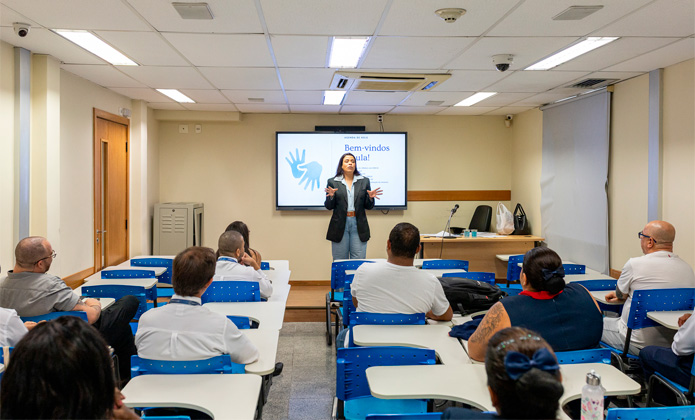 A aula, que reuniu servidores e colaboradores do Tribunal de Justiça do Rio de Janeiro (TJRJ), contou com uma dinâmica: os participantes formaram duplas e utilizaram cards com a representação das letras em Libras para montar o nome do colega. Ao final, cada dupla apresentou à turma a sinalização dos nomes, colocando em prática o que aprenderam.