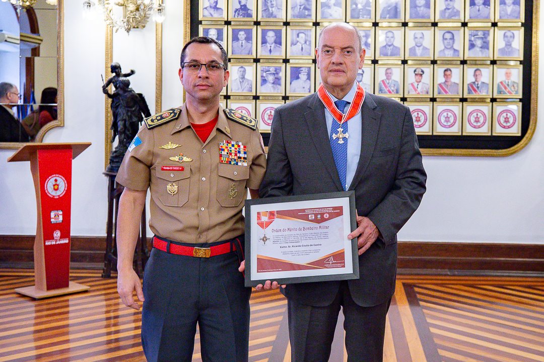 O presidente do Tribunal de Justiça do Estado do Rio de Janeiro (TJRJ), desembargador Ricardo Couto de Castro, foi agraciado, nesta quinta-feira (11/12), com a “Medalha da Ordem do Mérito do Corpo de Bombeiros Militar do Estado do Rio de Janeiro”, no grau comendador, em solenidade realizada no Salão Nobre do Comando-Geral, na Praça da República, no Centro. A honraria, uma das mais importantes da corporação, é concedida a personalidades civis e militares que prestaram serviços notáveis à instituição ou à sociedade. A medalha foi entregue ao desembargador pelo comandante-geral do Corpo de Bombeiros e secretário de Estado de Defesa Civil (Sedec -RJ), Tarciso Antônio de Salles Junior.