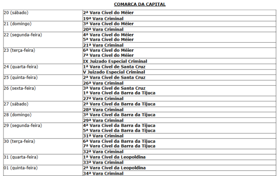 Nos feriados e finais de semana (dias 20, 21, 24, 25, 27, 28 e 31 de dezembro de 2025 e dias 1º, 3 e 4 de janeiro de 2026), haverá, na Comarca da Capital, o Plantão Judiciário diurno eletrônico, no horário compreendido entre 11h e 18h, com um juízo para as matérias cíveis em geral, e outro para as criminais. Nos dias 22, 23, 26, 29 e 30 de dezembro de 2025, e 2, 5 e 6 de janeiro de 2026, funcionará, na Comarca da Capital, o plantão diurno de recesso forense, também entre 11h e 18h.