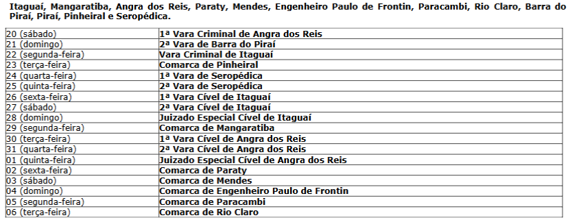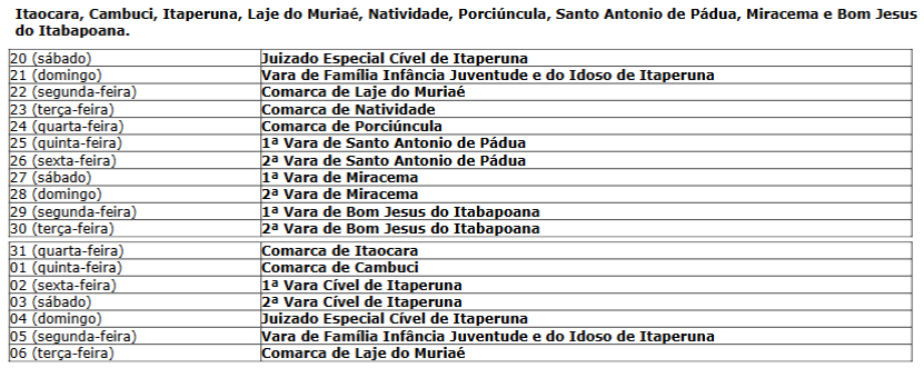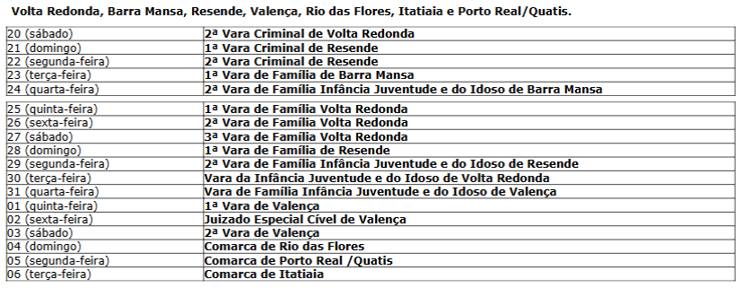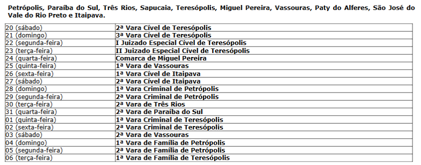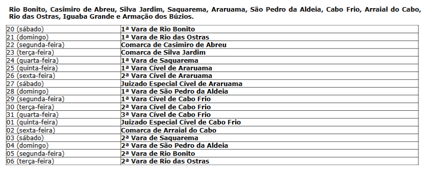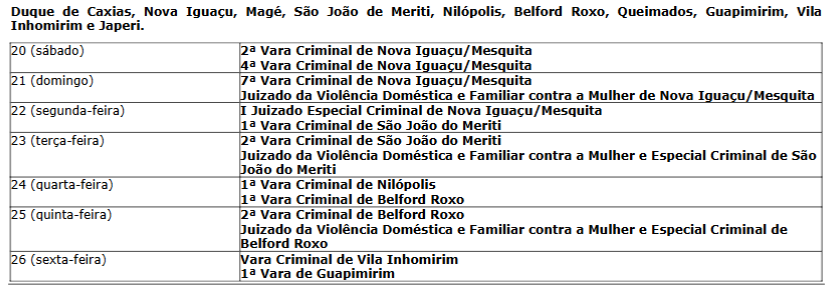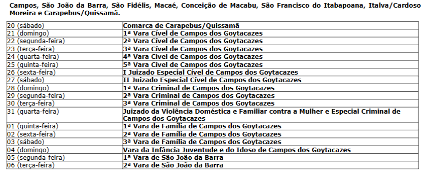 Nas comarcas do interior, o plantão e recesso funcionará no mesmo horário. As Centrais de Audiências de Custódia (Capital, Campos dos Goytacazes e Volta Redonda terão funcionamento normal durante todo o período de recesso forense em suas dependências, atendendo os feitos de suas respectivas competências.