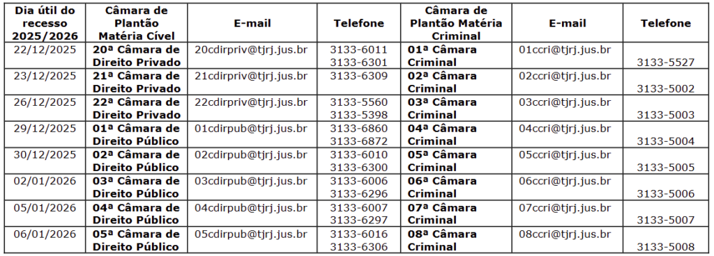 O recesso do Judiciário, que ocorre anualmente e foi iniciado no dia 20 de dezembro, segue até esta terça-feira, 6 de janeiro. No entanto, o Tribunal de Justiça do Rio de Janeiro (TJRJ) não para nem durante este período, em que permanece atendendo aos casos urgentes 24h por dia, como autorização para viagem de crianças e adolescentes, alvará de sepultamento, busca e apreensão de menores, internações em hospitais, mandados de prisões, casos de violência doméstica e familiar, alvará de soltura, habeas corpus, entre outros, que necessitam de uma resposta imediata do Poder Judiciário estadual. O Ato Normativo Conjunto TJ/CGJ/2ªVP nº 19/2025, que regulamenta o plantão judiciário de 1ª instância nos dias úteis durante o período de recesso forense, foi publicado no Diário da Justiça Eletrônico do dia 18 de setembro de 2025.