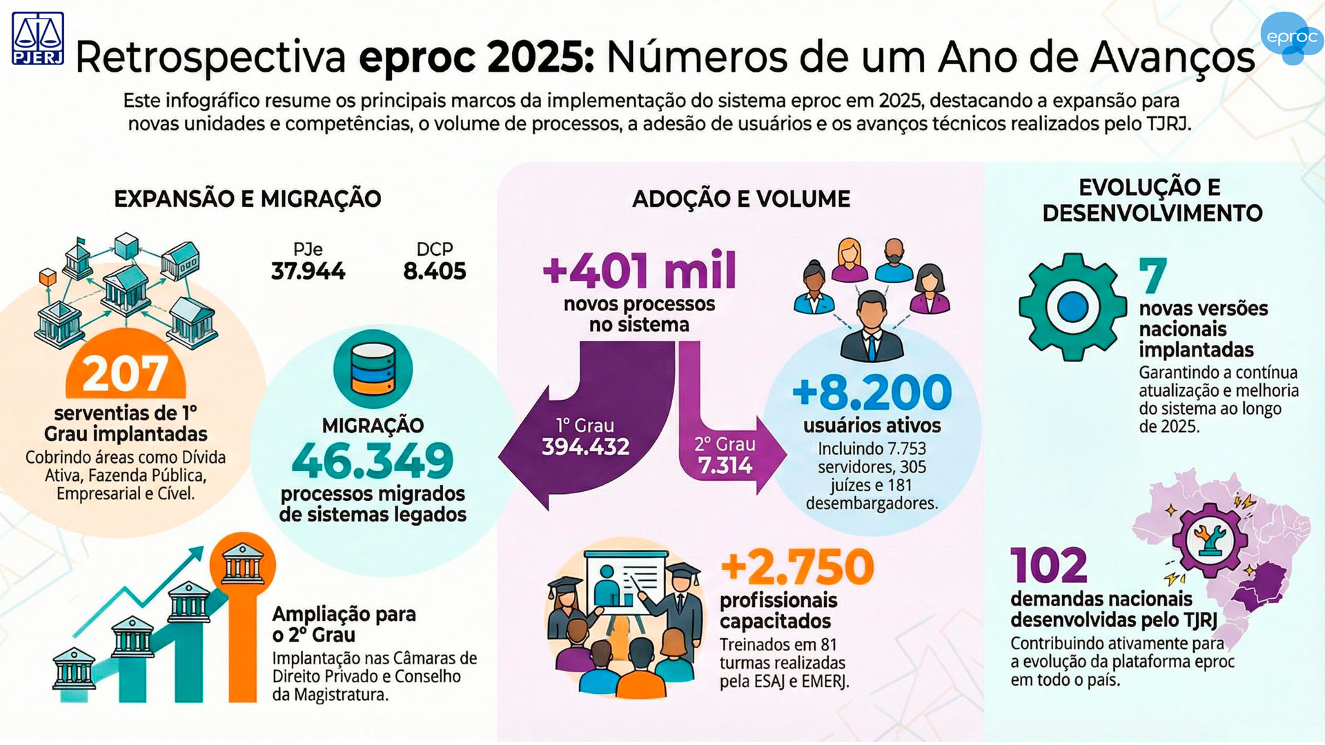 Utilizado por diversos tribunais de todo o Brasil, o sistema judicial eproc foi desenvolvido para oferecer eficiência, agilidade e transparência na tramitação de processos judiciais eletrônicos a partir de funcionalidades tecnológicas. Com cerca de 750 mil processos em seu acervo, a ferramenta já é uma realidade na rotina das serventias do Tribunal de Justiça do Rio de Janeiro e, nos primeiros meses de 2026, ultrapassou a marca de 150 mil processos migrados dos sistemas anteriores PJe e DCP.