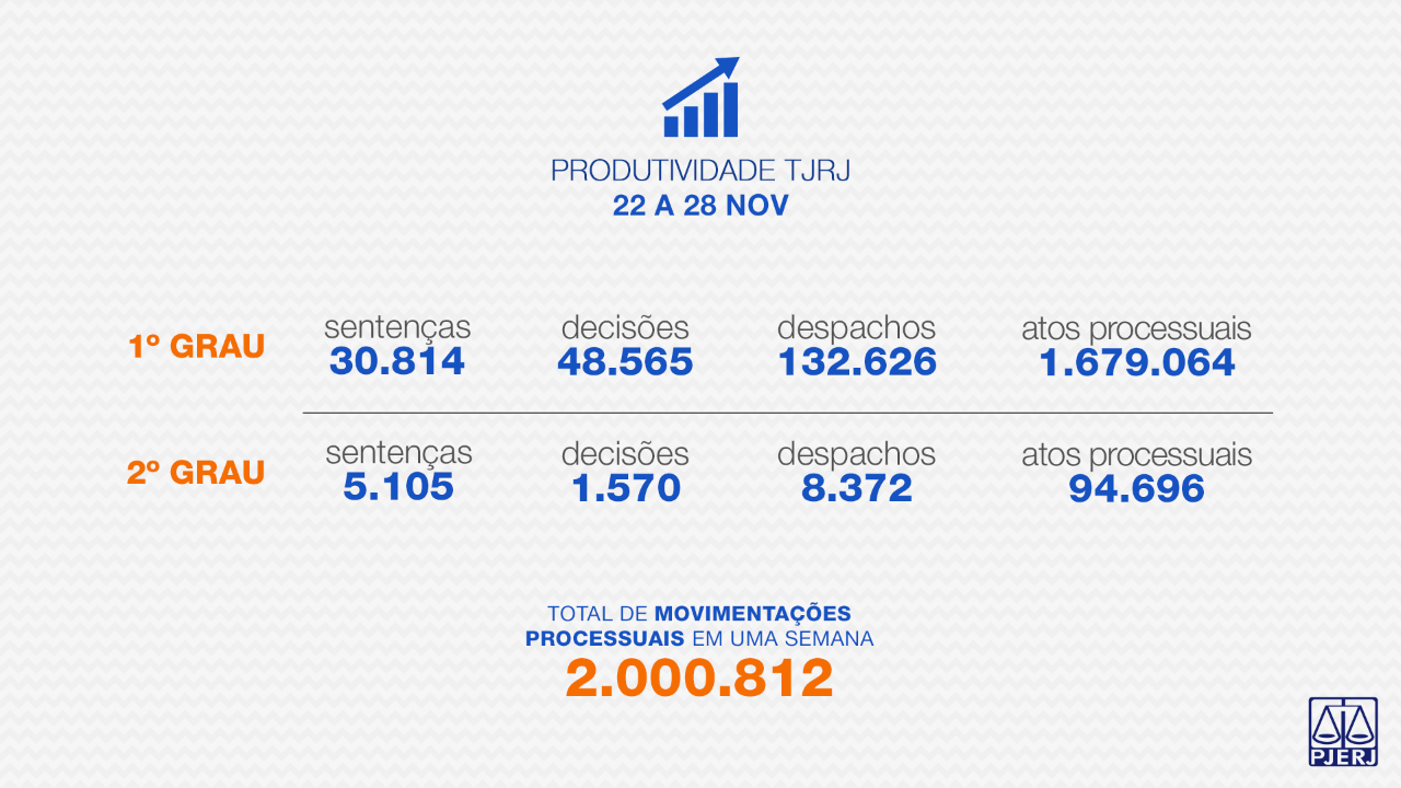 Os servidores do Tribunal de Justiça do Estado do Rio de Janeiro (TJRJ) produziram, na semana de 22 a 28 de novembro, 35.919 sentenças (30.814 na primeira instância e 5.105 na segunda instância); 50.135 decisões (48.565 na primeira instância e 1.570 na segunda instância); 140.998 despachos (132.626 na primeira instância e 8.372 na segunda instância); e 1.773.760 atos cumpridos por servidores (1.679.064 na primeira instância e 94.696 na segunda instância).