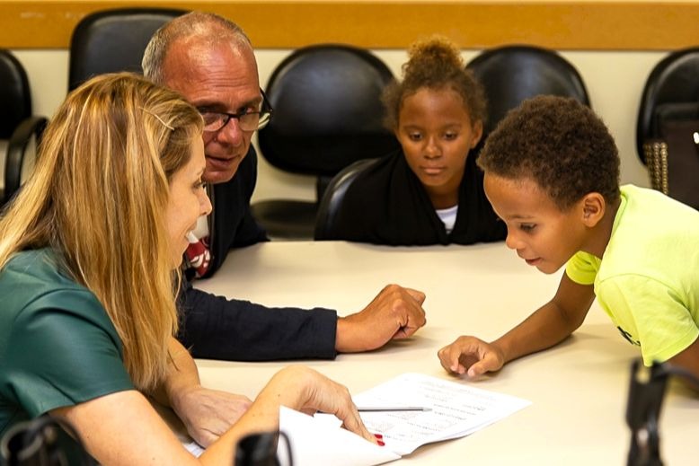 O italiano Erminio Garofano, 58 anos, chega à audiência em sua cadeira de rodas. A esposa, Daniela Guerra, 41, esboça um sorriso tímido que logo se abre nas brincadeiras com Carlos (9 anos) e Sonia (17 anos). No mês passado, a 3ª Vara da Infância, da Juventude e do Idoso (VIJI) da Regional de Madureira autorizou a adoção internacional de Carlos, Sonia e de outros três irmãos – Laiane, Ana Cristina e Richard, que ficaram com o casal Donato e Grazia. O passo a passo para as duas adoções foi conduzido pela Comissão Estadual Judiciária de Adoção Internacional (CEJAI) do Tribunal de Justiça do Estado do Rio de Janeiro (TJRJ). As novas famílias deixaram o Brasil esta semana.